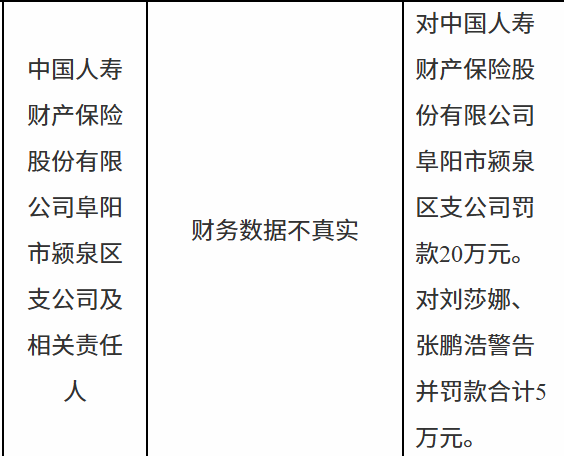 1月5日股票配资app下载,国家金融监督管理总局阜阳监管分局行政处罚信息公示表显示,中国人寿财产保险股份有限公司阜阳市颍泉区支公司及相关责任人因财务数据不真实被罚款20万元。刘某娜、张某浩被警告并罚款合计5万元。